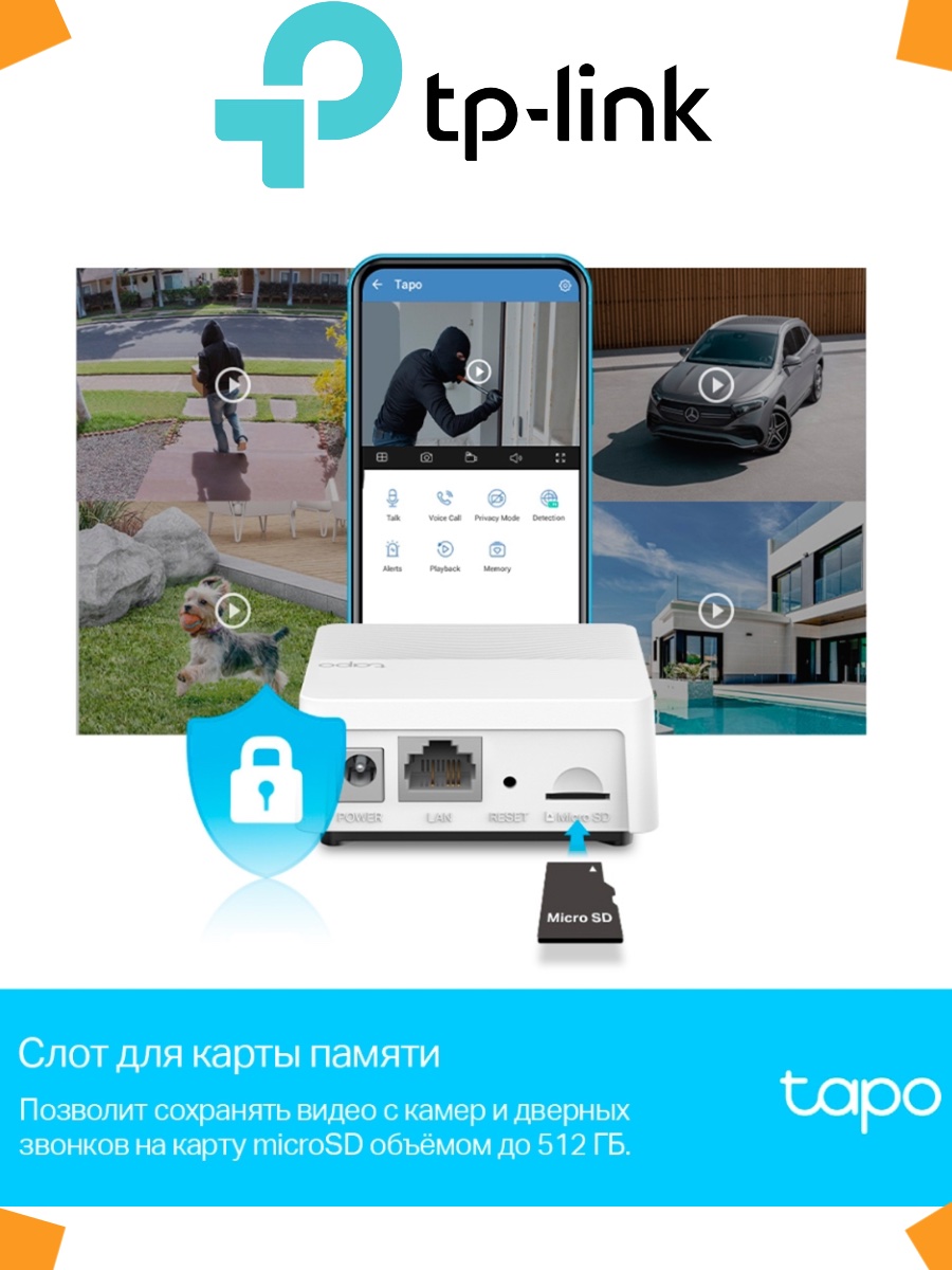 Благодаря поддержке Sub-1G и Wi-Fi Tapo H200 также включает поддержку камер наблюдения Tapo C420 и C400 с батарейным питанием и видеодомофона Tapo D230. К одному концентратору можно подключить четыре совместимые камеры или видеодомофоны. Благодаря слоту для карты памяти в хабе камеры и видеодомофон производят запись локально прямо на карту памяти, установленную в хабе.