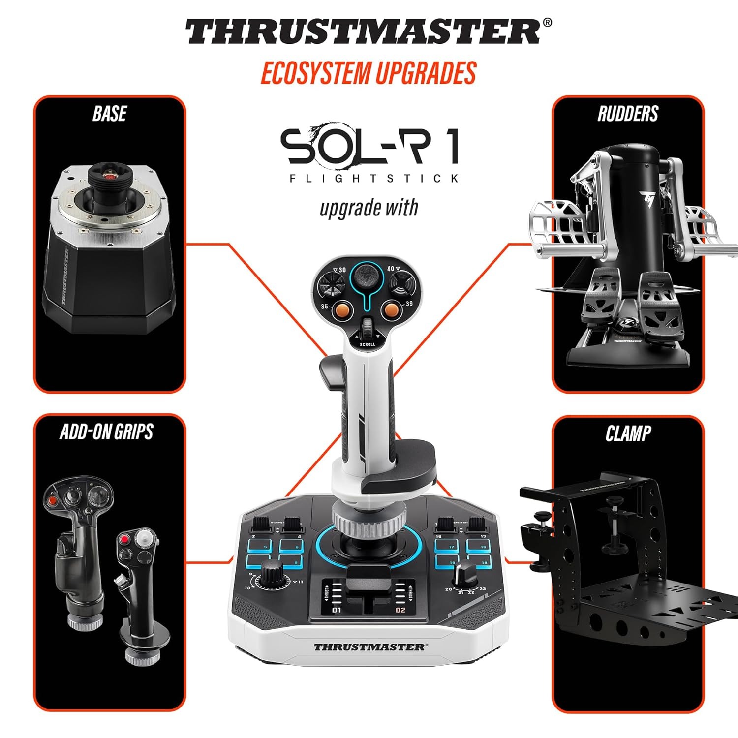 Космос ваш! Отправьтесь в путешествие к звёздам с джойстиком Sol-R 1 Flightstick, который перенесёт вас в космические сражения и исследования. Симметричный джойстик оснащён 44 кнопками, восемью осями, двумя курками, мини-джойстиком и штурвалом. Съёмная ручка позволяет использовать подставку с другими ручками Thrustmaster. Эргономичные особенности включают программируемую RGB-светодиодную подсветку и индикаторы питания. Что оно может? Покоряйте звезды с помощью идеального космического оборудования