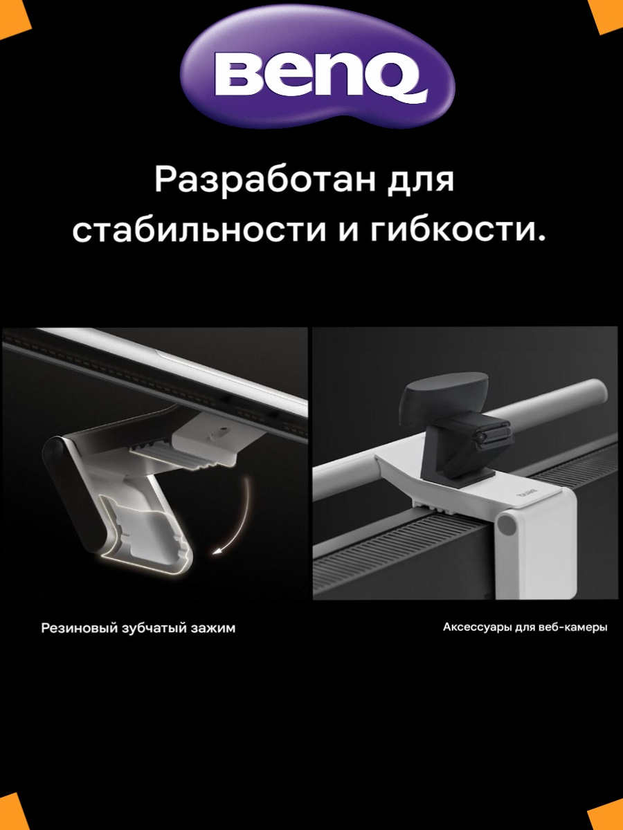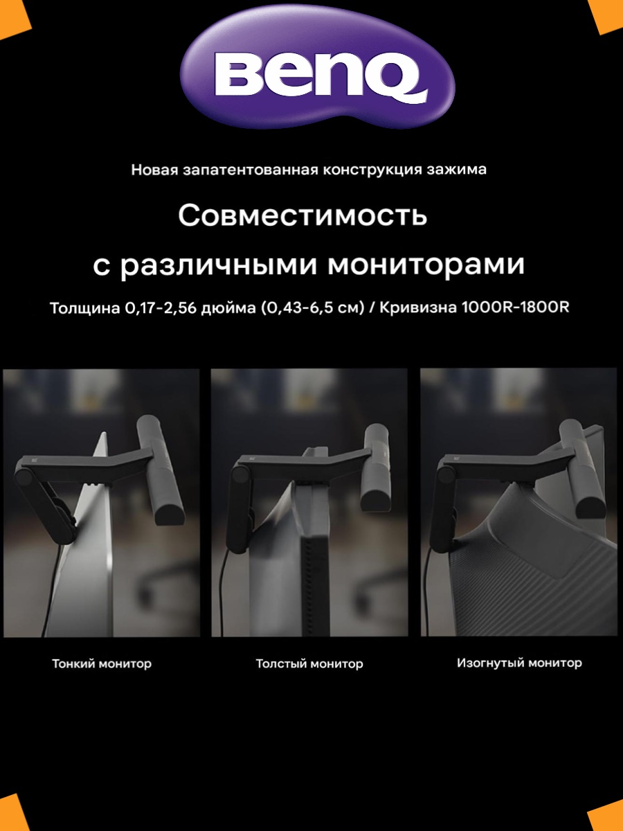 ВЫСОКАЯ СОВМЕСТИМОСТЬ – подходит для мониторов толщиной 0,43–6,5 см и радиусом кривизны 1000–1800R. Запатентованная конструкция зажима подходит для мониторов со специальной задней панелью или неплоской верхней рамкой. Простая установка, не блокирует объектив камеры.
