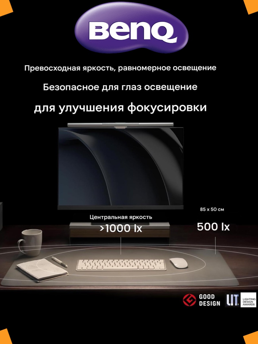 ScreenBar Pro обеспечивает центральную яркость более 1000 лк и диапазон 500 лк в пределах 85 см x 50 см, превосходя по характеристикам большинство настольных ламп и повышая комфорт для глаз благодаря достаточному освещению.