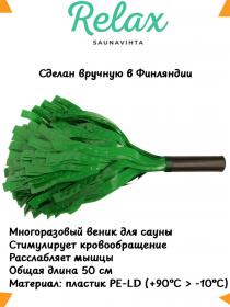 Веник Relax Saunavihta вручную изготовлен в Финляндии из долговечных материалов. Этот веник Relax также подходит для людей, страдающих аллергией на березу. Рабочая температура от -10 до +90 ° C.