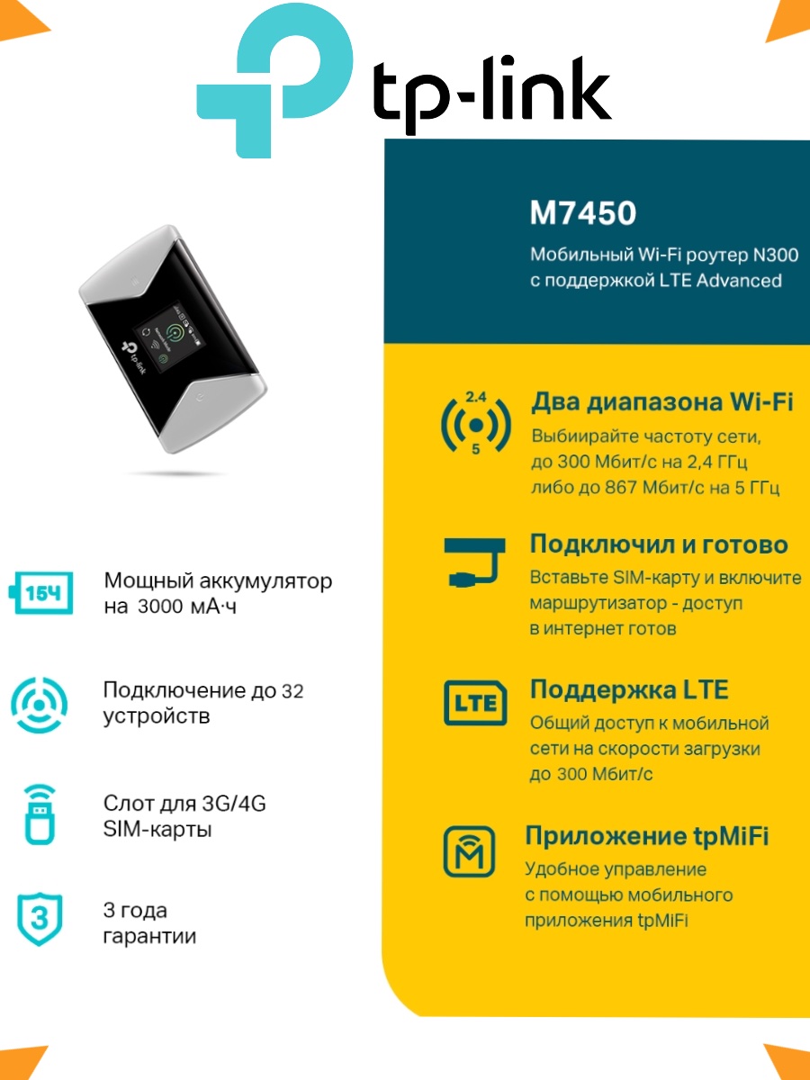 TP-Link M7450 - портативный роутер Wi‑Fi N300 с поддержкой LTE Advanced категории 6 с максимальной скоростью скачивания 300Мбит/с.