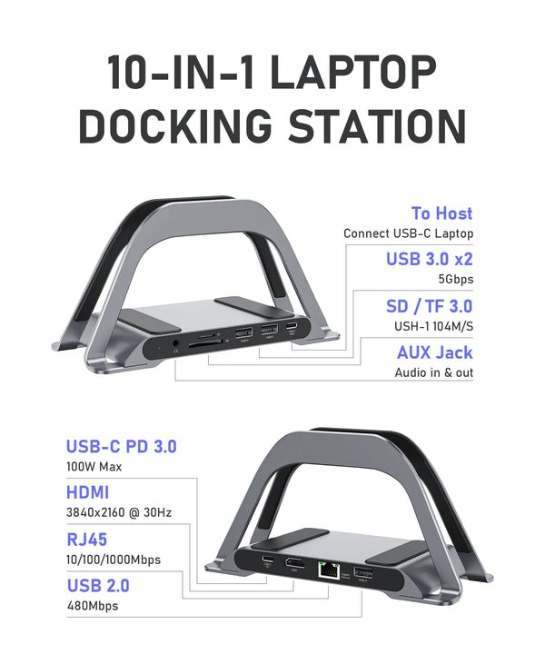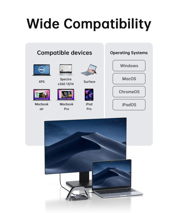 Совместимая док-станция с Dell также обладает двойной функцией, которая может удовлетворить различные потребности пользователей, а также выполнять функцию подставки для ноутбука (улучшение использования рабочего стола). Одна из функций заключается в том, что съемная подставка может служить подставкой для вашего ноутбука, помогая увеличить пространство, создать больше рабочего места и повысить вашу производительность.