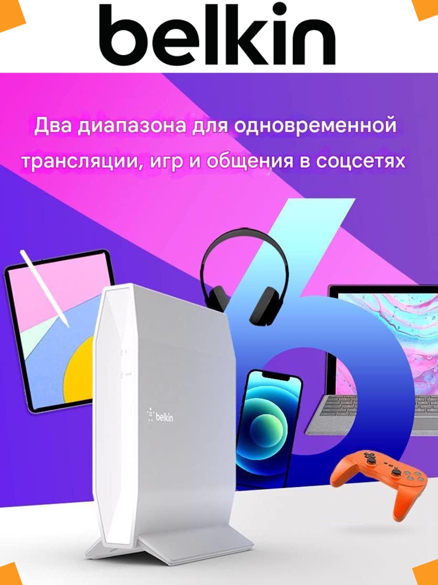 Маршрутизатор Belkin AX3200 WiFi 6 обеспечивает высокую скорость для более чем 25 устройств в вашей домашней сети. Плавные, стабильные и надежные сигналы означают, что каждый может бесплатно транслировать, играть и твитить. Вы будете уверенно общаться в школе, работе из дома и других важных онлайн-деятельности. Благодаря своему гладкому современному дизайну и родительскому контролю AX3200 является долгожданным дополнением для любой семьи. Настройка и управление на основе браузера означают, что легко начать работу и легко управлять настройками, чтобы создать Wi-Fi, который работает на вас. Настройте гостевую сеть, чтобы вы могли делиться интернетом, а не личными данными, с друзьями и семьей. Технические характеристики: скорость AX3200 WiFi, до 3,2 Гбит/с; 1x Gb WAN-порт, 4x Gb LAN-порта; 1x USB 2.0 порт; Двухдиапазоны для одновременной потоковой передачи, игр и социальных сетей; Родительский контроль и гостевая сеть; Автоматическое обновление прошивки; Простая настройка на основе браузера; WPA3 Безопасность; Пакет подключения кнопок WPS включает в себя: RT3200 WiFi 6 маршрутизатор; Краткое руководство по запуску; Кабель Ethernet; Адаптер питания; Нормативная и гарантийная документация * Фактическая производительность может варьироваться в зависимости от многочисленных факторов окружающей среды, включая, но не ограничиваясь этим; планировка здания, материалы и методы строительства, сочетание используемых беспроводных устройств и присутствующих уровней помех.